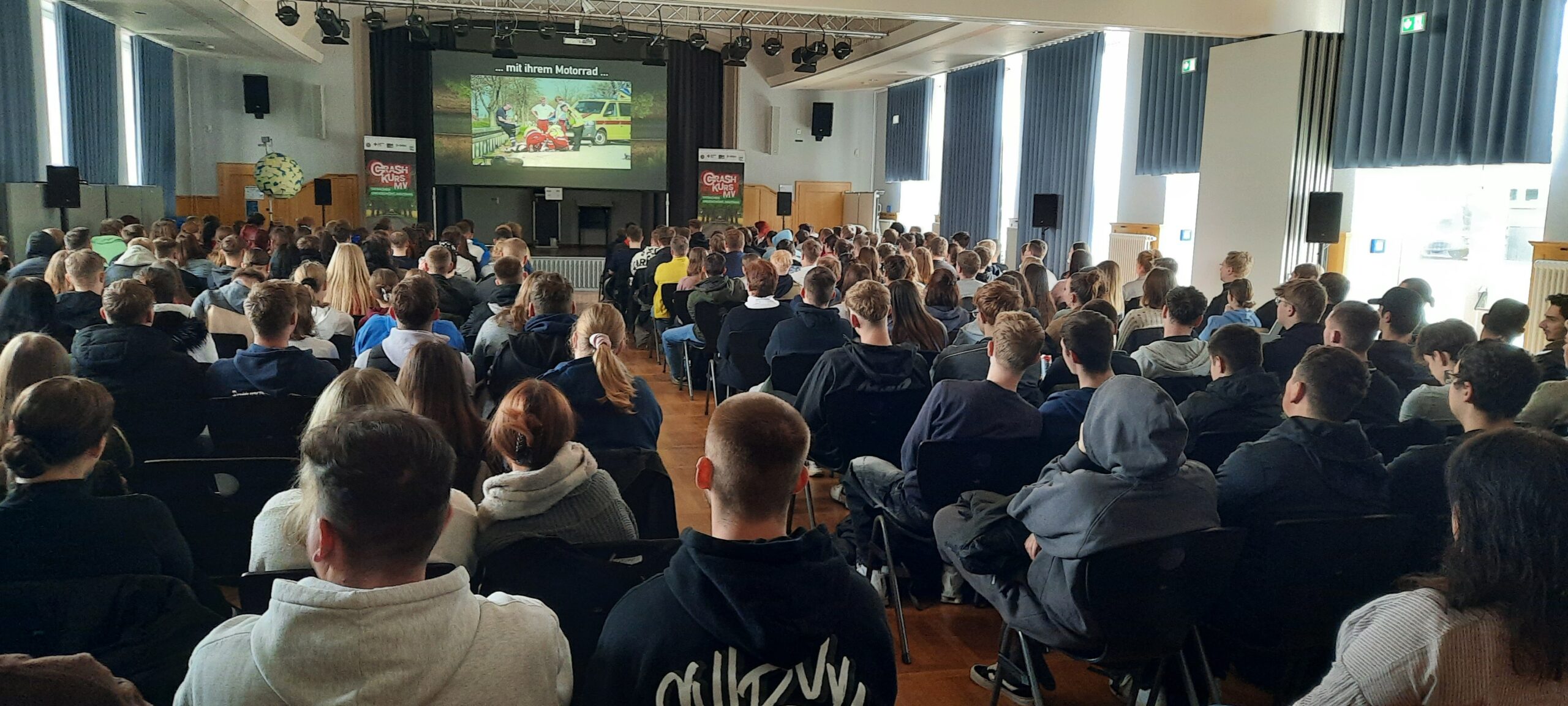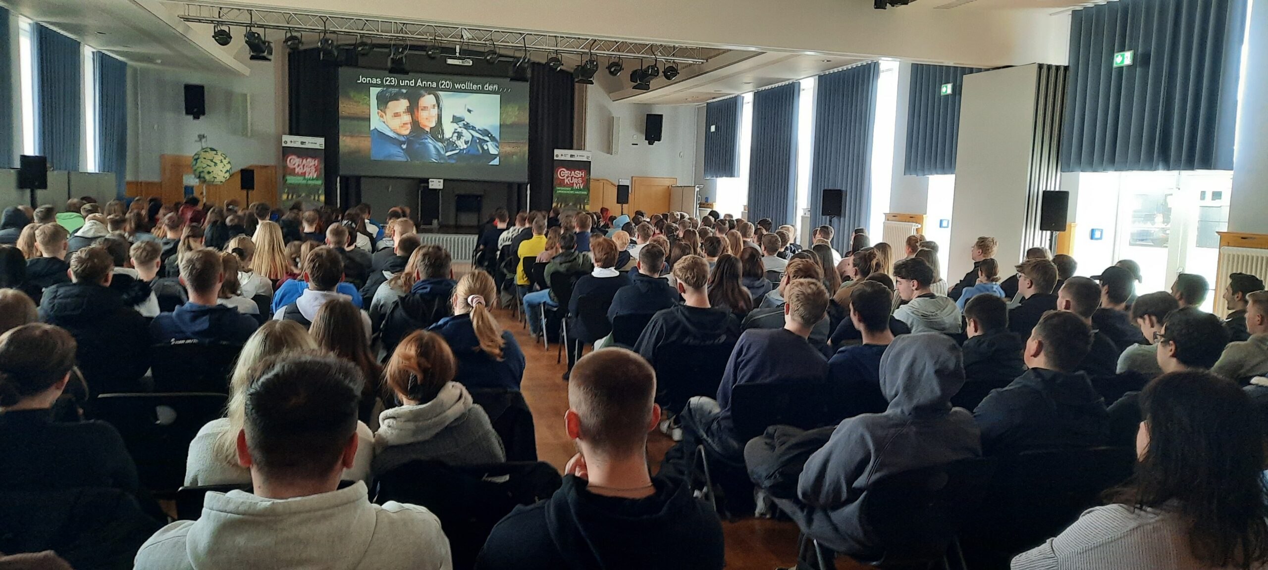 Das Präventionsangebot der Polizei hat zum Ziel, die Zahl der schweren Verkehrsunfälle mit jungen Fahrerinnen und Fahrer zu verringern. Den 300 Schülerinnen und Schülern des RBB NB GeSoTec wurden hautnah und ungeschönt Tatsachen zu Verkehrsunfällen mit jungen Fahrerinnen und Fahrern gezeigt. Sie konnten sehr gut nachvollziehen, wie schnell Lebensträume zerplatzen können.